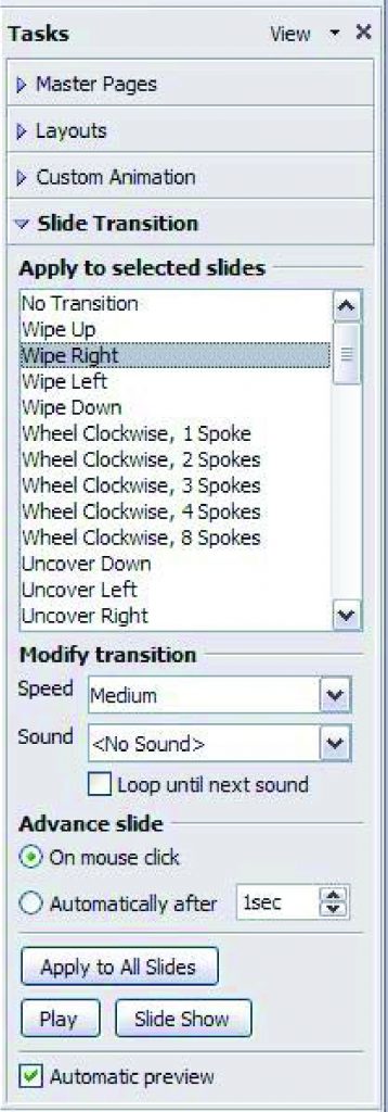 Pada Task Pane, pilih slide Transition. Dalam modus slides pane atau slide sorter, pilih slide yang diinginkan untuk diterapkan efek perpindahan. Apabila mengingikan efek perpindahan untuk semua slide yang ada, kita tidak perlu melakukan seleksi. Selanjutnya kita dapat memilih efek transisi yang diinginkan untuk seluruh slide yang ada, seperti gambar disamping. Kustomisasikan efek perpindahan pada bagian Modify transition, pada bagian ini kita dapat mengubah kecepatan dan memberikan suara tambahan. Apabila anda mengingikan suara efek suara terus dimainkan berulangulang, beri tanda cek (√) pada bagian Loop until next sound. Klik tombol, Apply to All slides untuk menerapkan pengaturan efek perpindahan slide yang kita inginkan. Tekan tombol Play untuk meninjau kembali tampilan efek perpindahan antar slide yang telah kita buat sebelumnya. Tekan tombol slide Show untuk memulai slide show sehingga dapat melihat keseluruhan transisi slide.