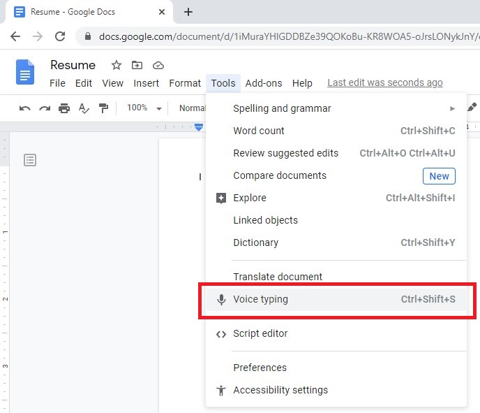 4. Setelah itu pilih menu Tools dan Voice Typing