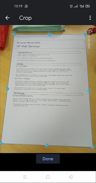 • Pilih tombol Crop yang ada di paling kanan. Akan muncul garis dengan 8 titik biru yang dapat digeser mengikuti tepi kertas, sehingga hasil crop dokumen berbentuk persegi panjang, tegak lurus menghadap kita.